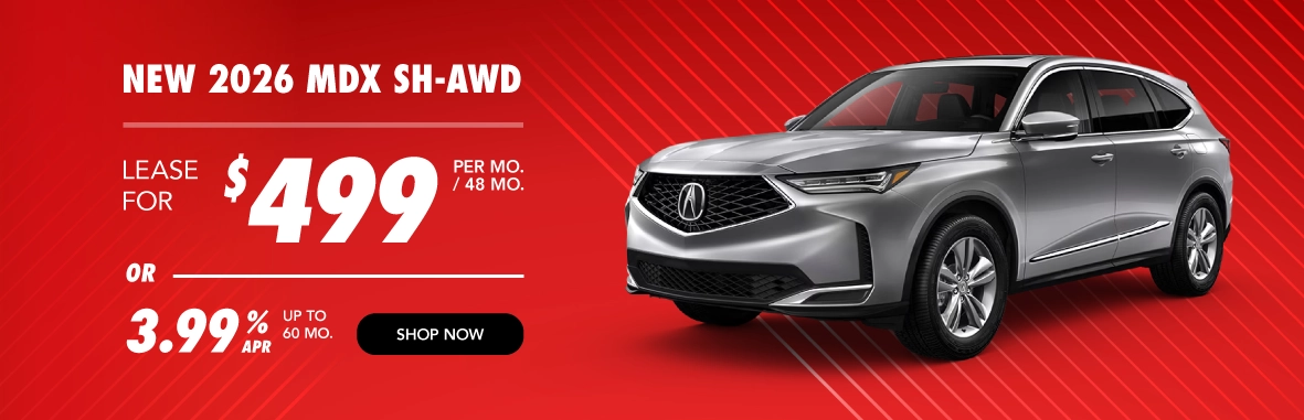 *Offers subject to change. See dealer for details. Lease does not include tax, tag, and title. Does not include dealer installed accessories, $565 administrative fee, or $600 color upcharge. New 2026 Acura MDX SH-AWD lease. $499/month for 48 months and 7,500 miles a year. $6,595 down. Dealers set actual prices. $1,000 cap cost reduction. Must qualify for Loyalty/Conquest Offer. Loyalty/Conquest Eligibility: Current owners of any 2016 or newer Acura, Audi, BMW, Buick, Cadillac, Genesis, Honda, Infiniti, Lexus, Lincoln, Mercedes-Benz, Tesla or Volvo vehicle. 3.99% financing and special lease offer are available for well qualified buyers, and is subject to approval. Offers run 01/06/2026 through 03/02/2026.